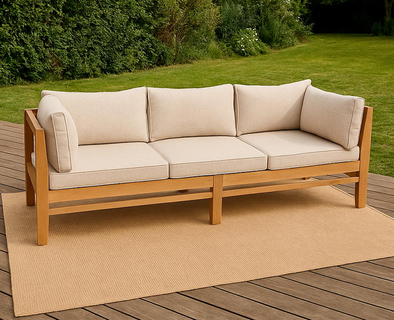 Tæppet er vævet i kraftig polyester (900 g/m²), hvilket giver en tæt og blød struktur, der minder om indendørs tæpper. Det er både slidstærkt og behageligt at gå på – og samtidig praktisk. Polyesterens vandafvisende egenskaber sørger for, at regnvand hurtigt drænes af, mens UV-beskyttelsen forlænger tæppets levetid og farveægthed under solen.